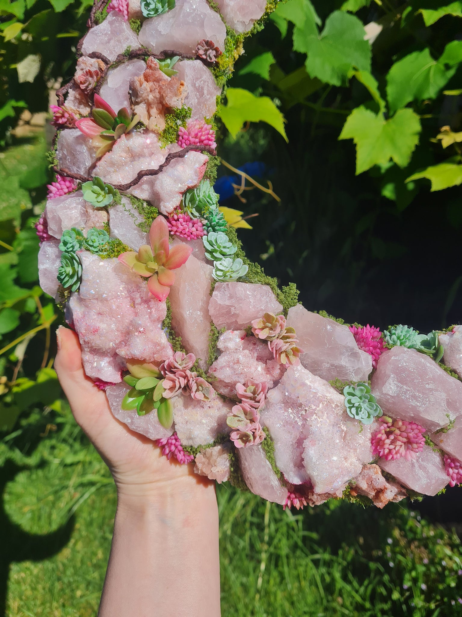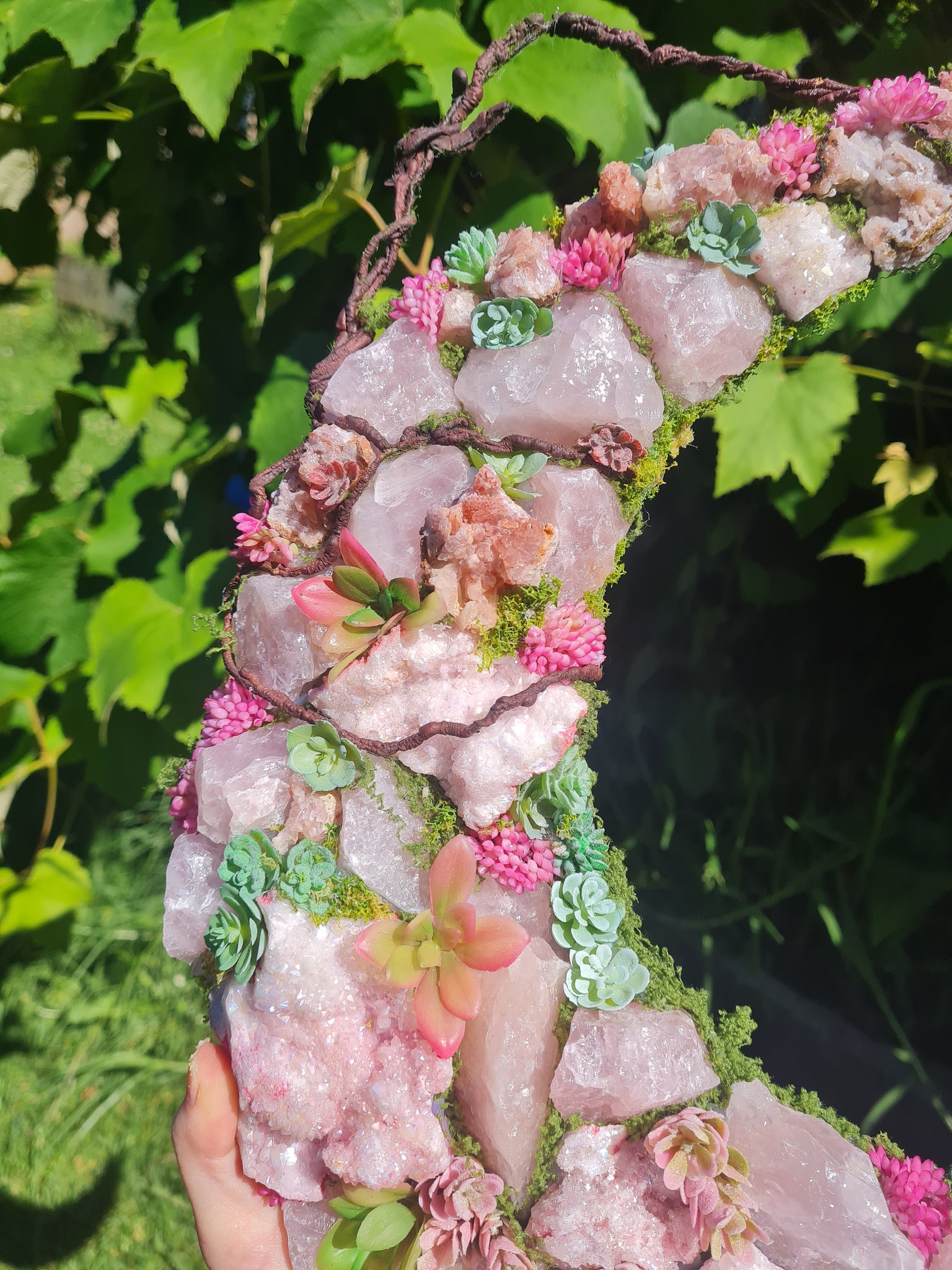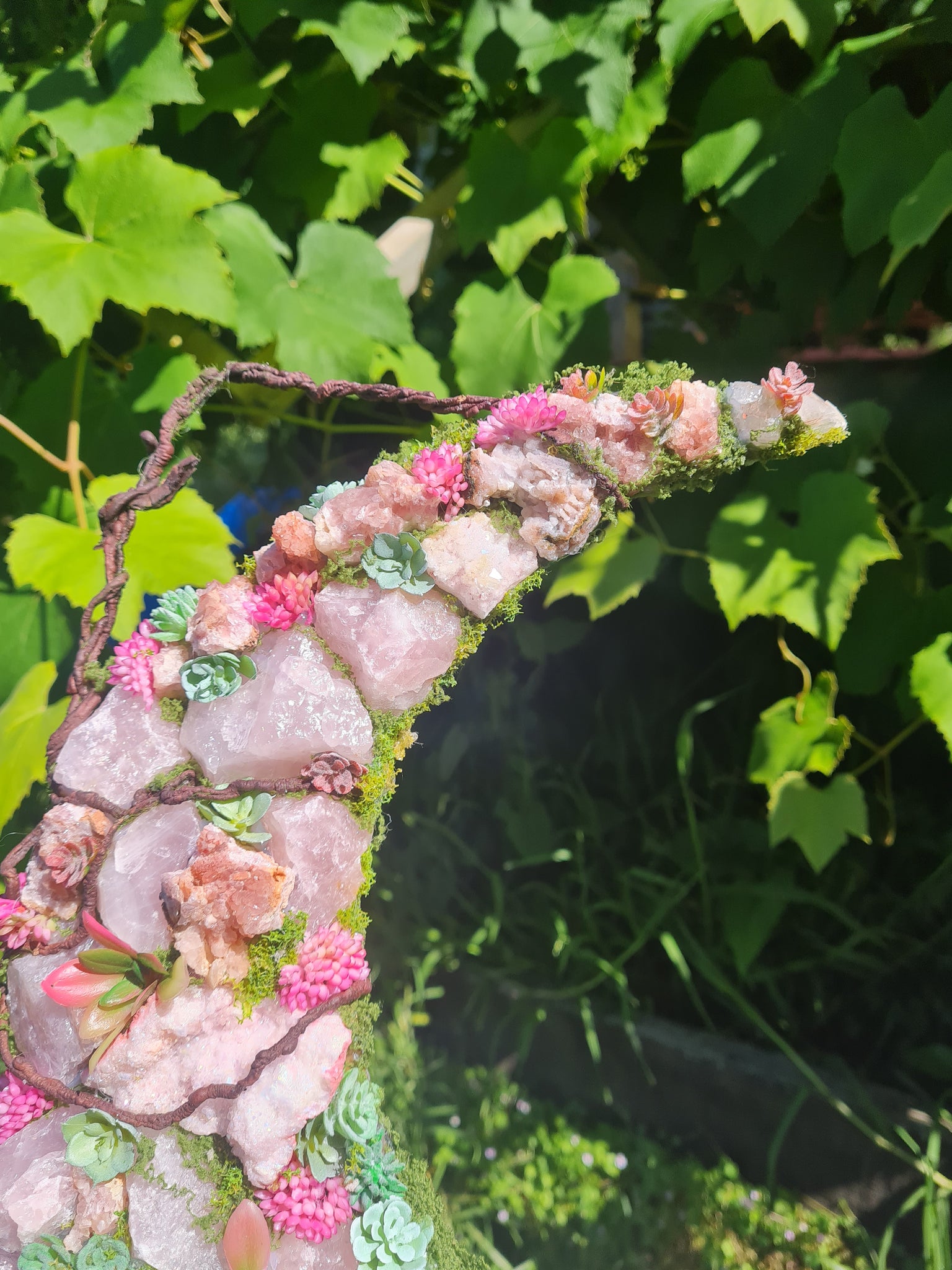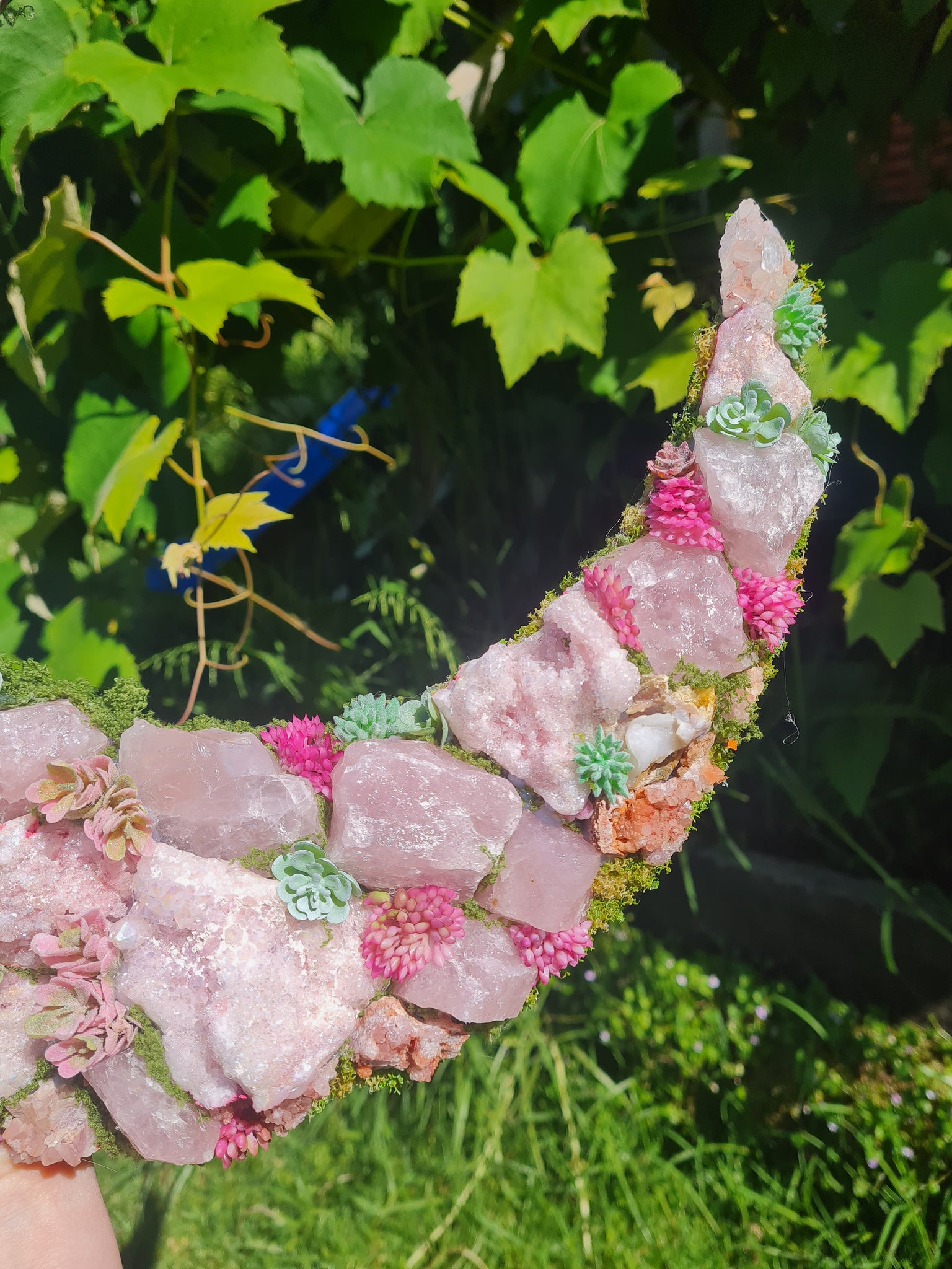 Shes filled with beautiful Aura Clusters, Rose Quartz and lush green moss